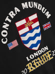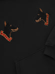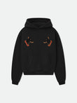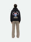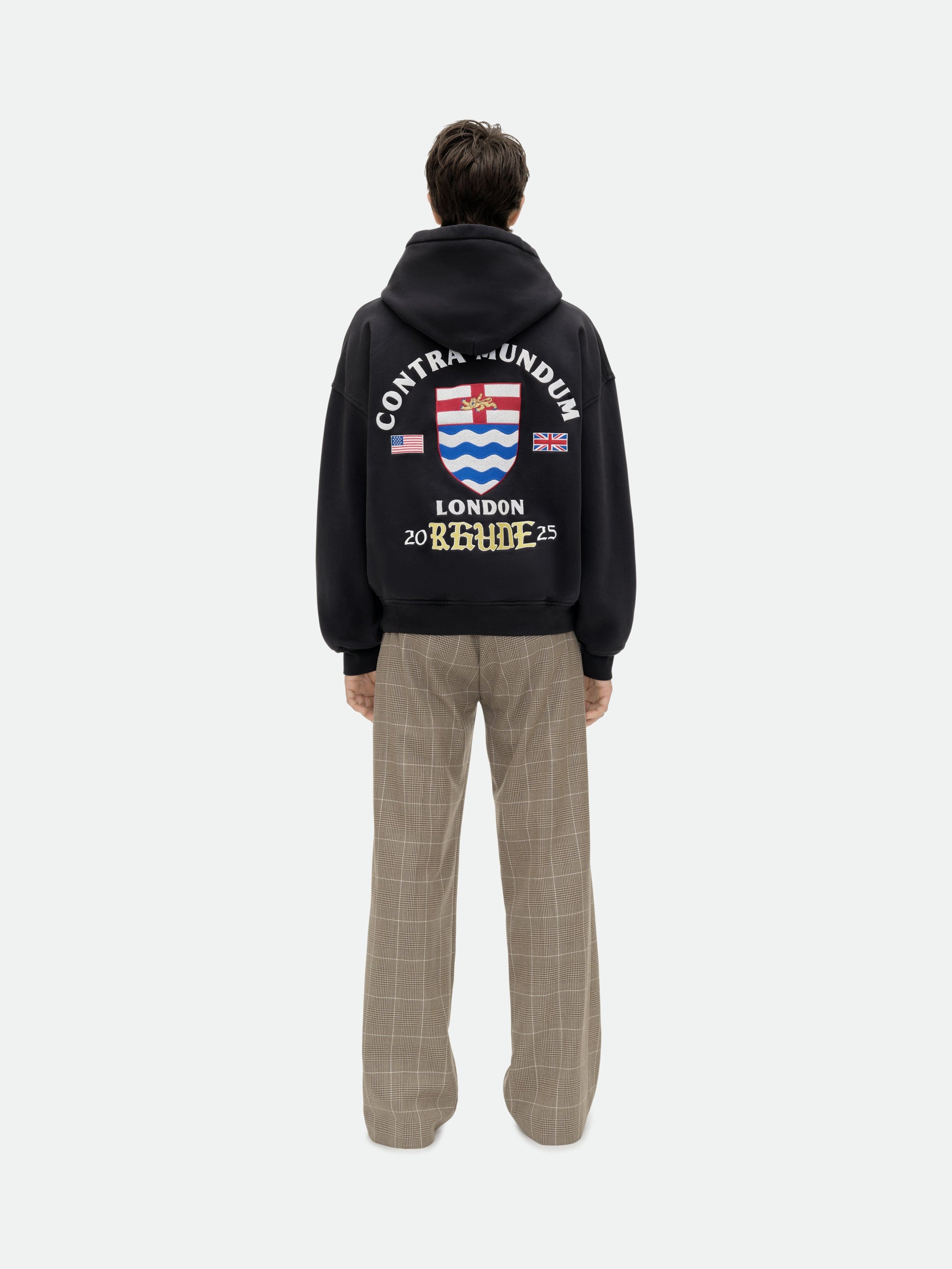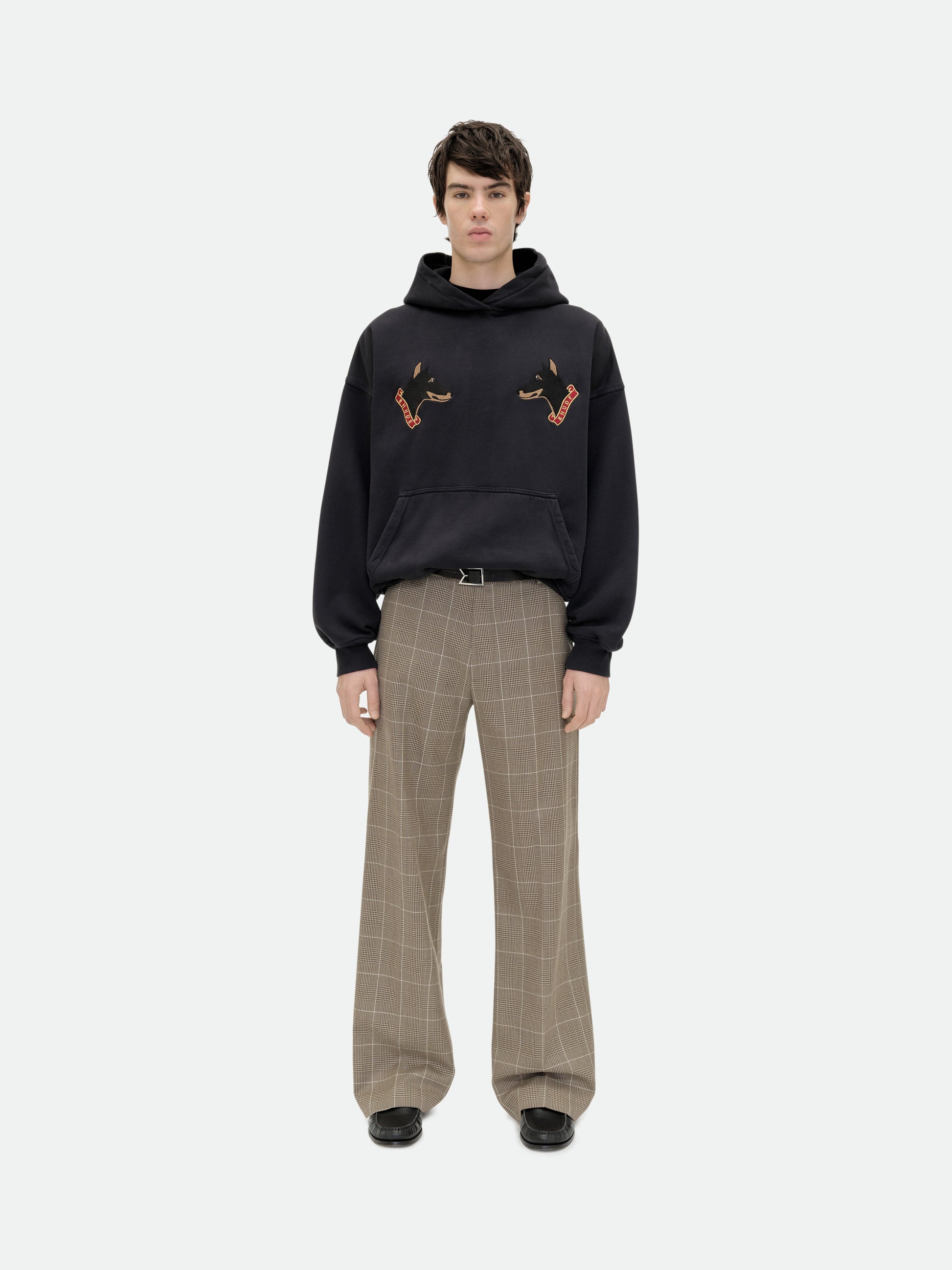 Long sleeve French Terry hoodie with Rhude london hounds on the front, with a rhude designs throughout the back. Featuring a kangaroo front pocket and dropped shoulders. Each piece is unique and print distressing my vary per style.