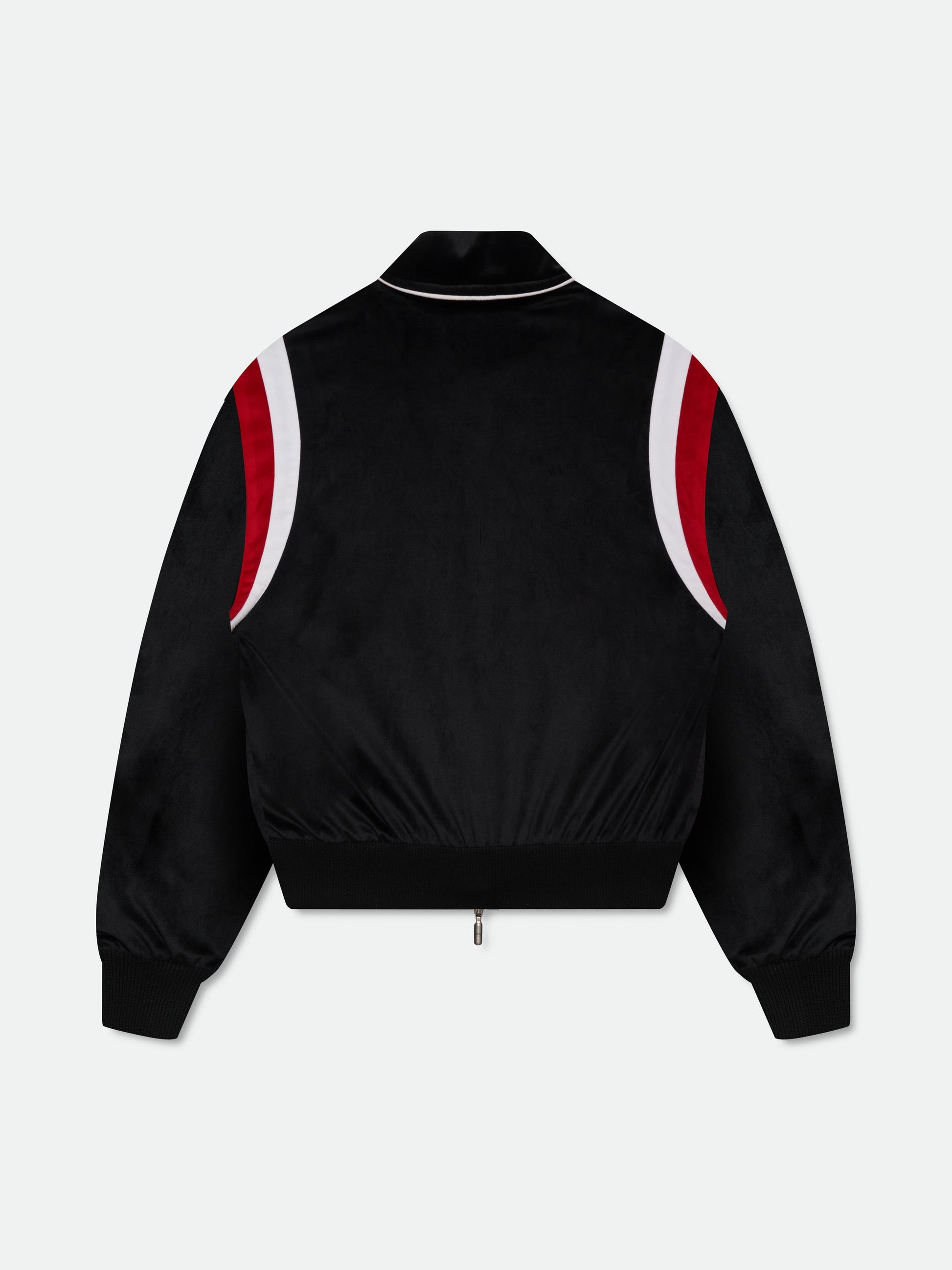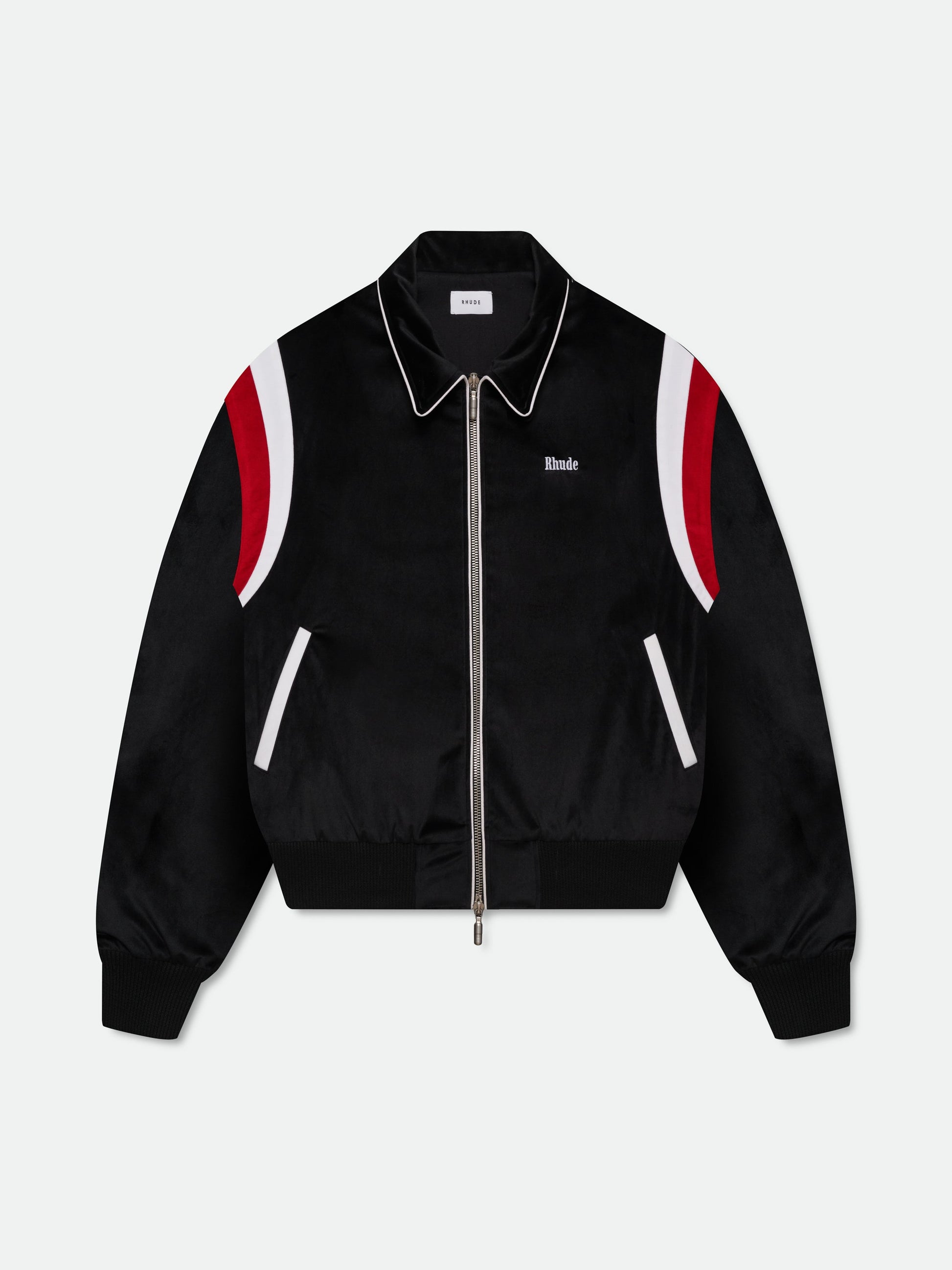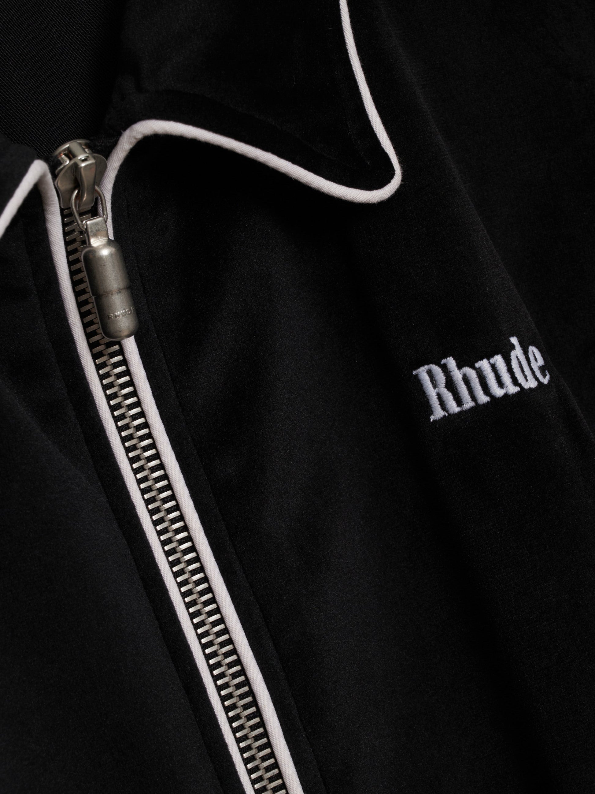 Velour track varsity jacket with Rhude logo on front, and appliques at each shoulder. Finished with a ribbed waist and cuffs for added comfort and style, along with custom two-way Rhude Pill zipper closure.