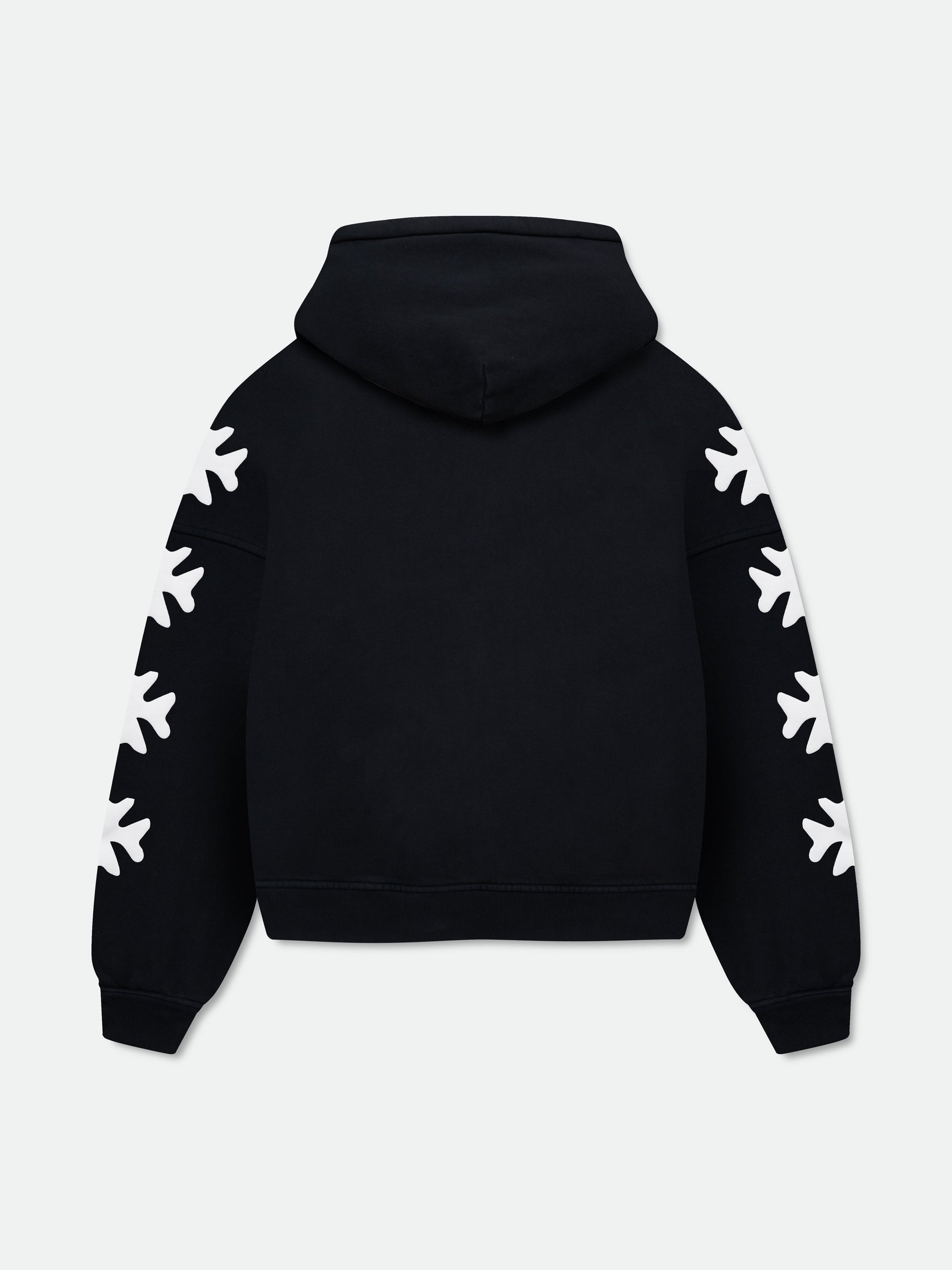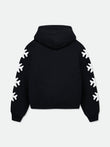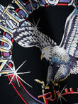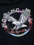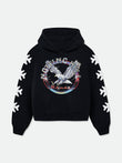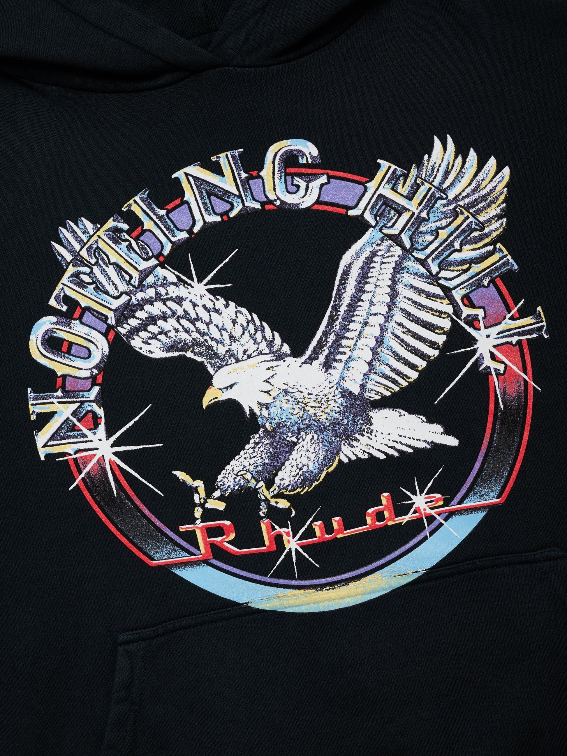 Long sleeve French Terry hoodie with Rhude notting hill eagle graphic designs printed on the front and sleeves, with a clean back. Featuring a kangaroo front pocket and dropped shoulders. Each piece is unique and print distressing my vary per style.