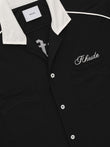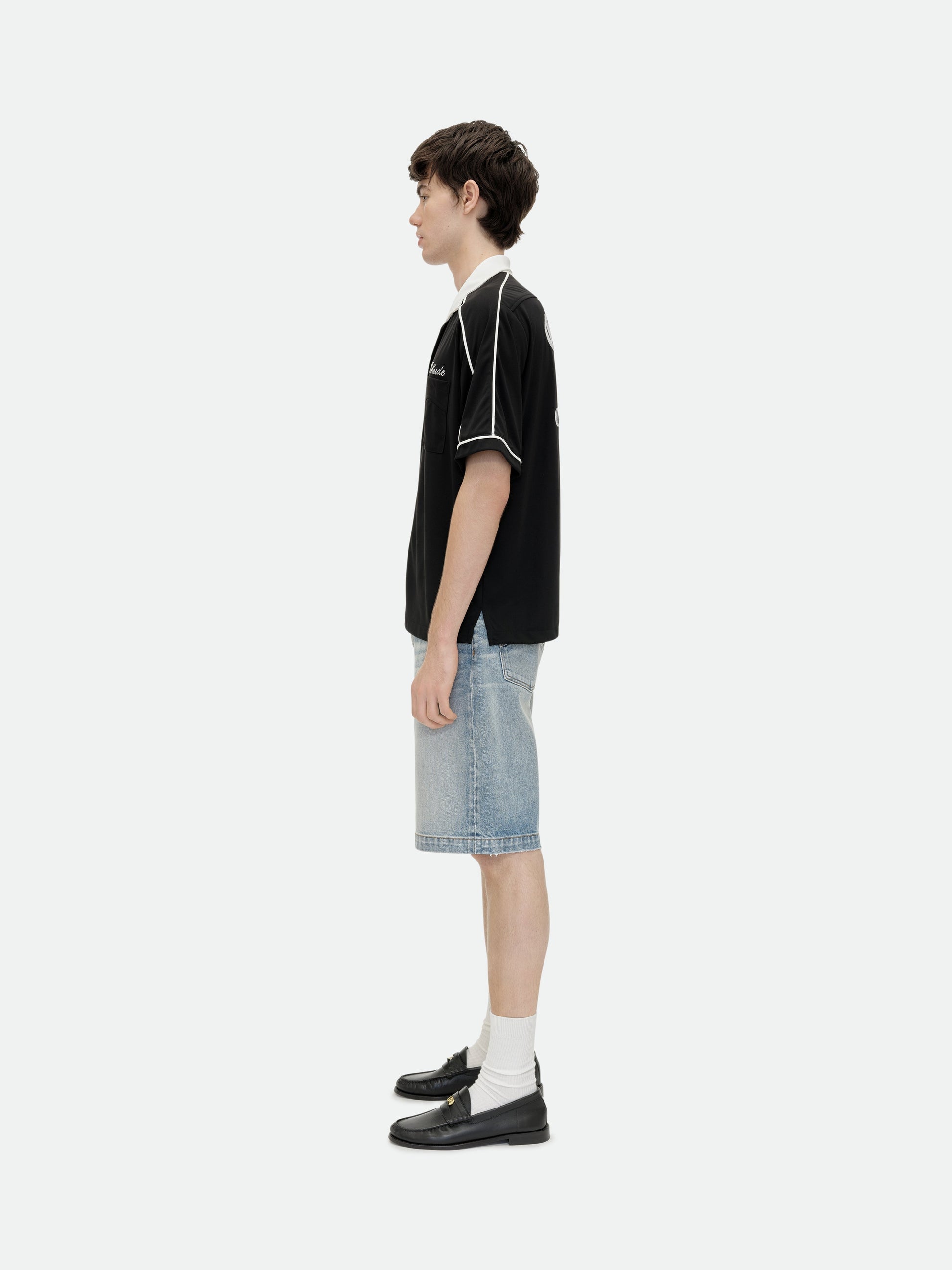 This retro bowling shirt pays tribute to Oxford. Features a front button closure, a notched collar, elbow-length sleeves, and chest patch pockets.