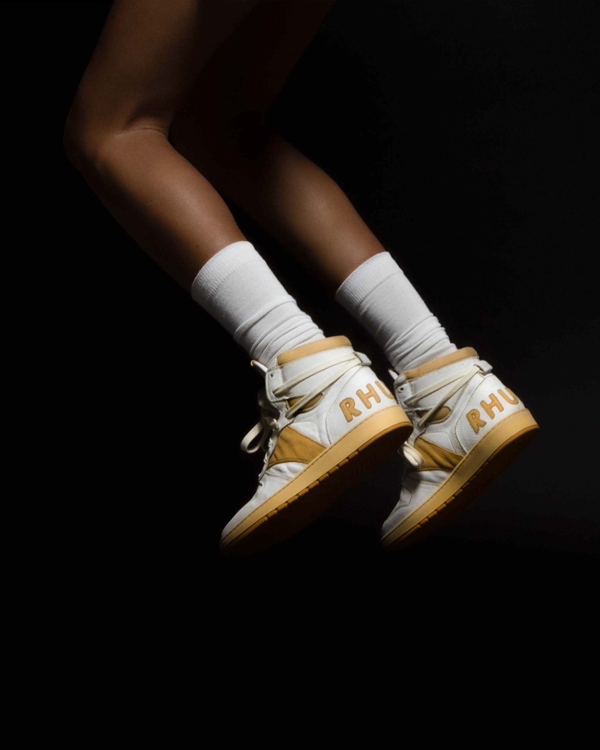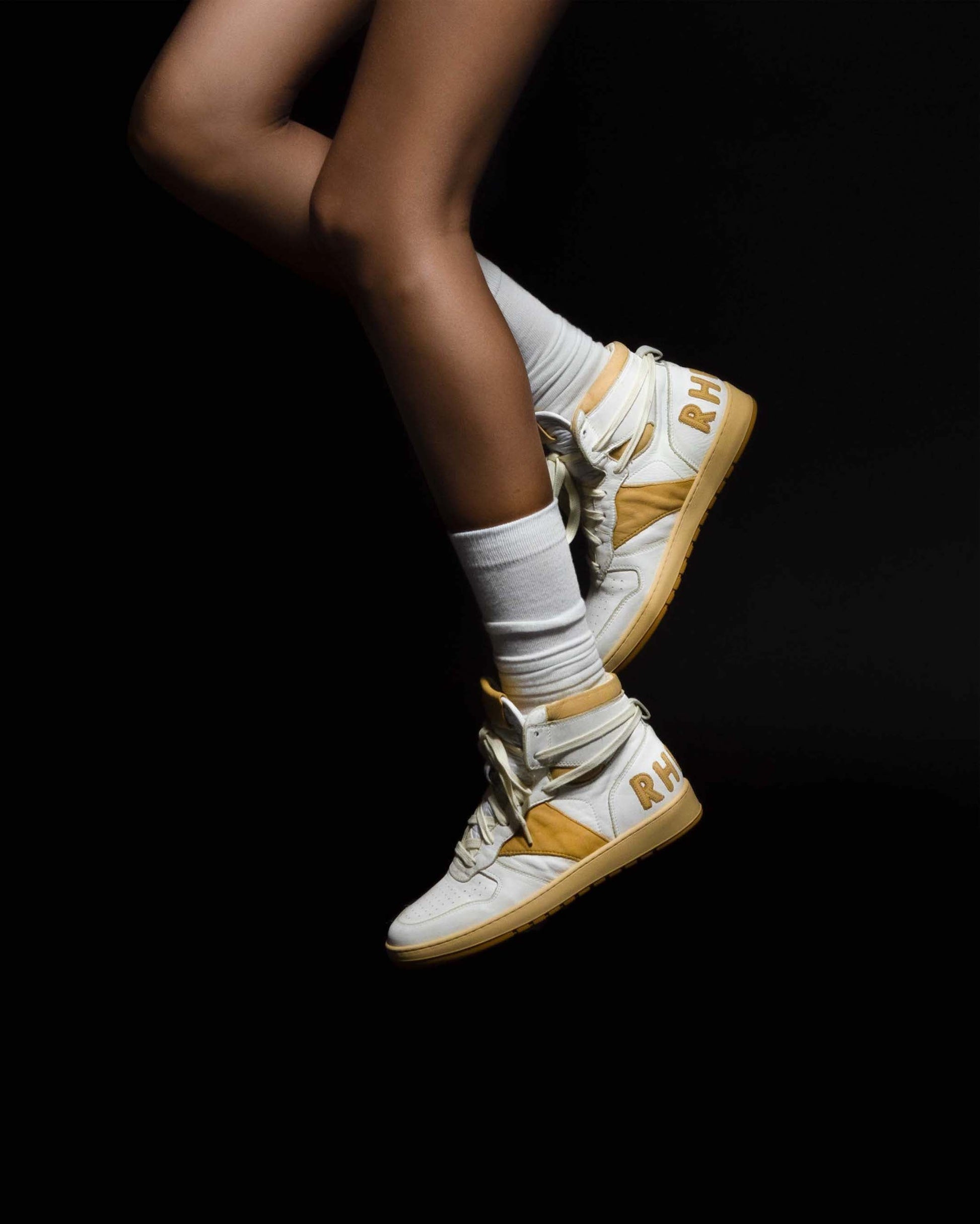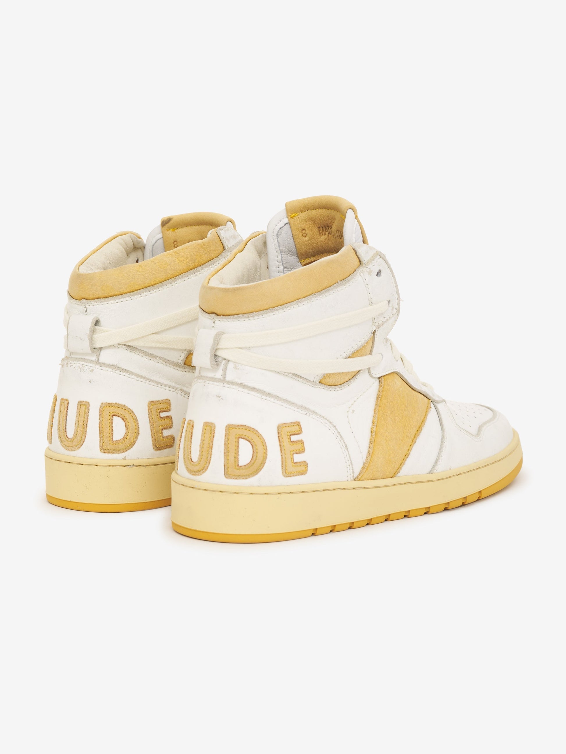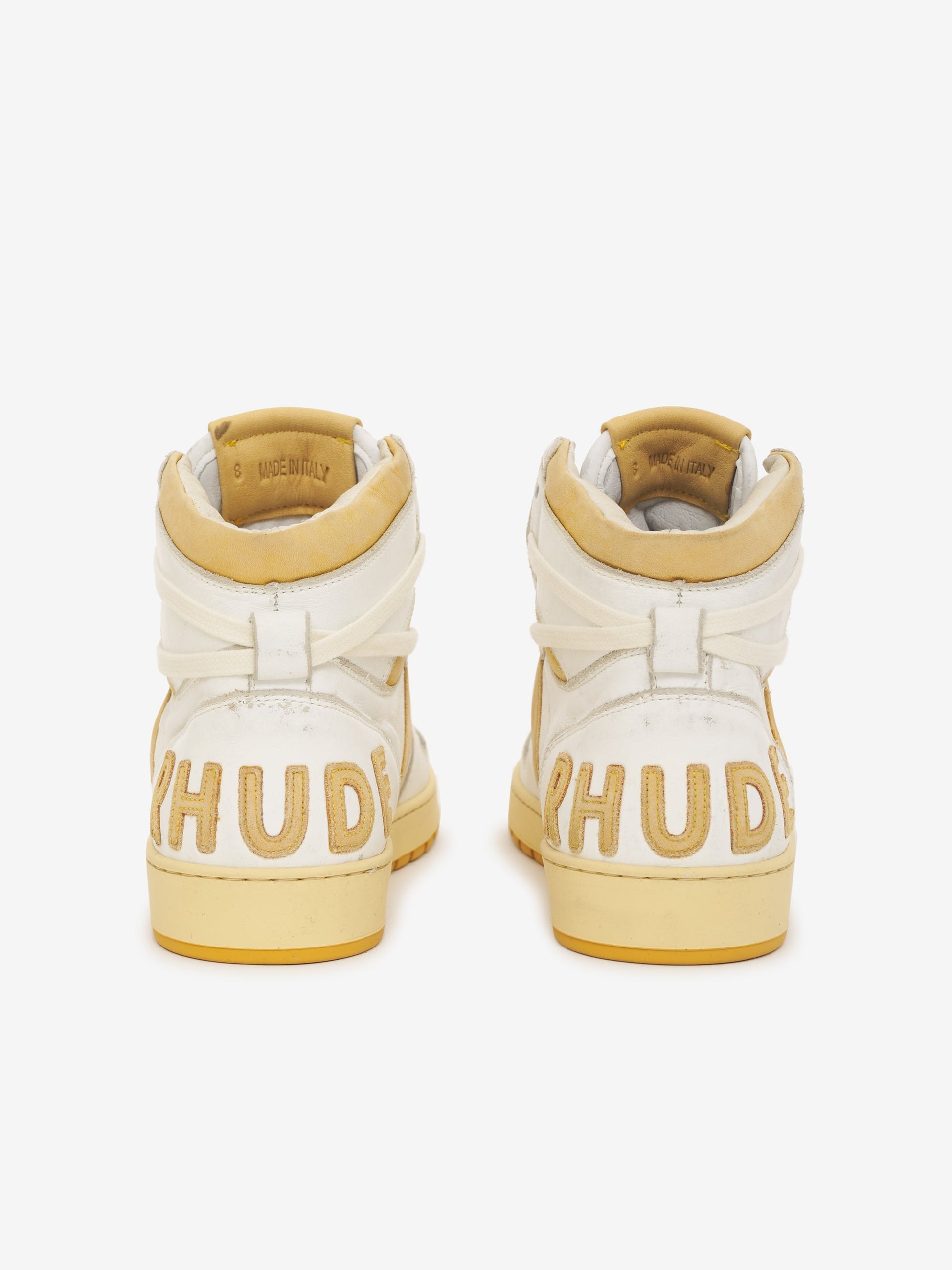 Women's high top leather basketball sneaker hand made in Italy with vintage details. Hand distressed abrasions and imperfections throughout. Vintaged yellow sole. Leather logo heel applique.
