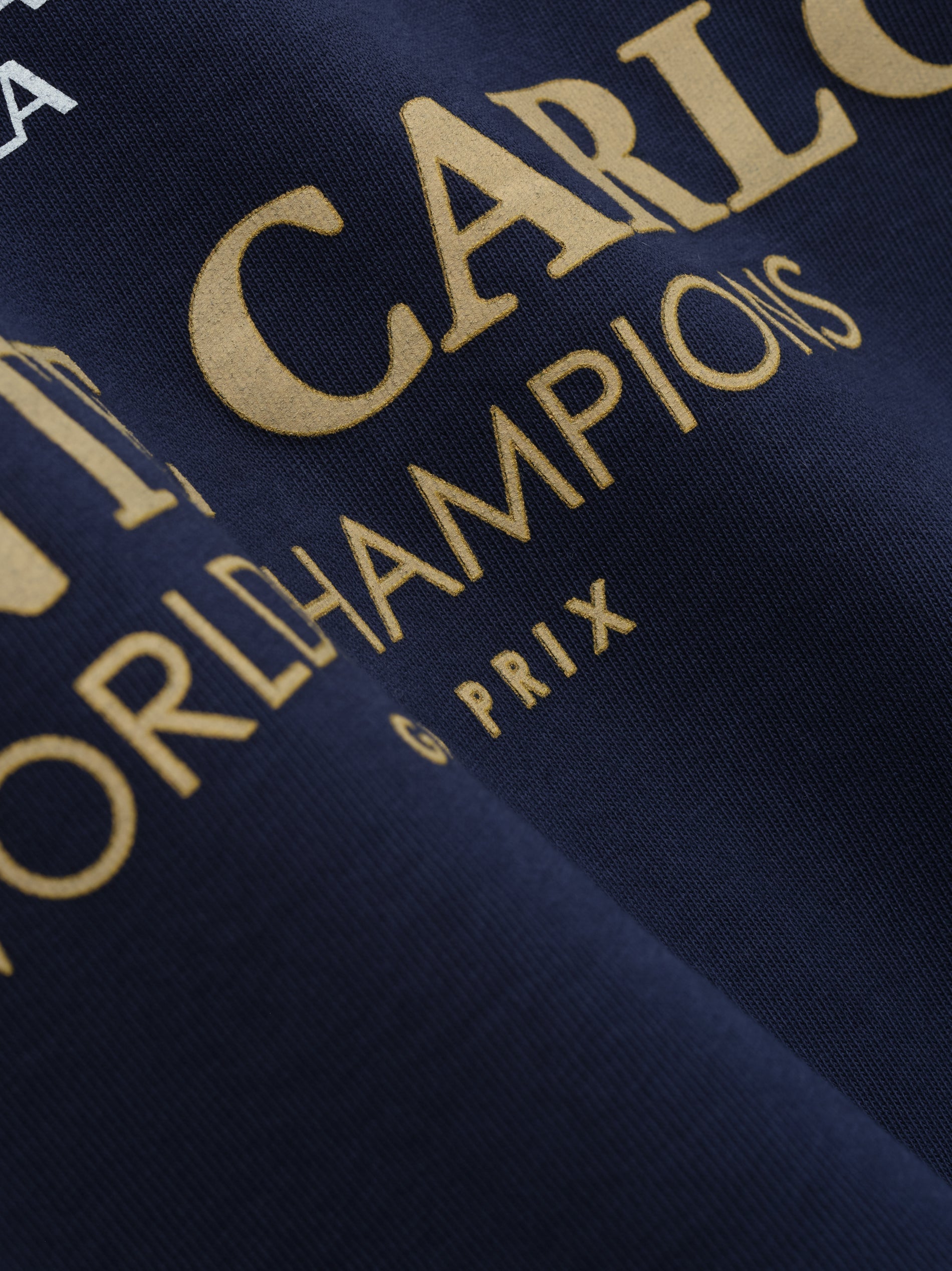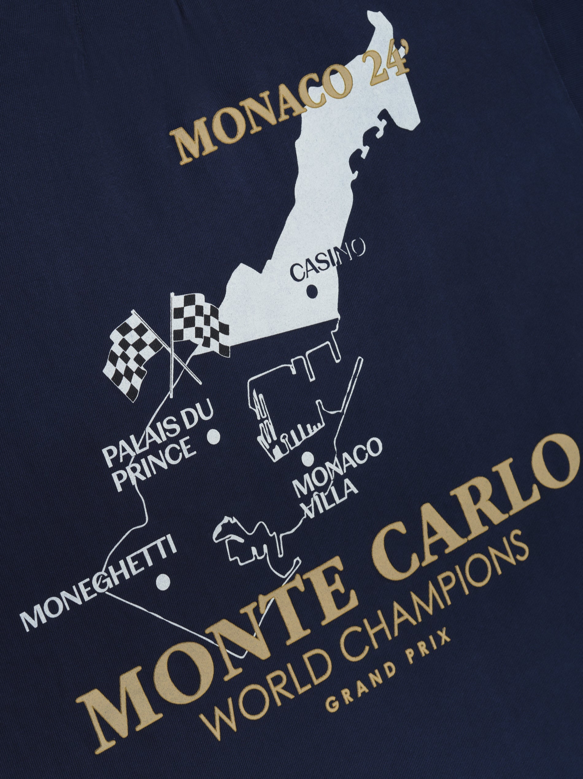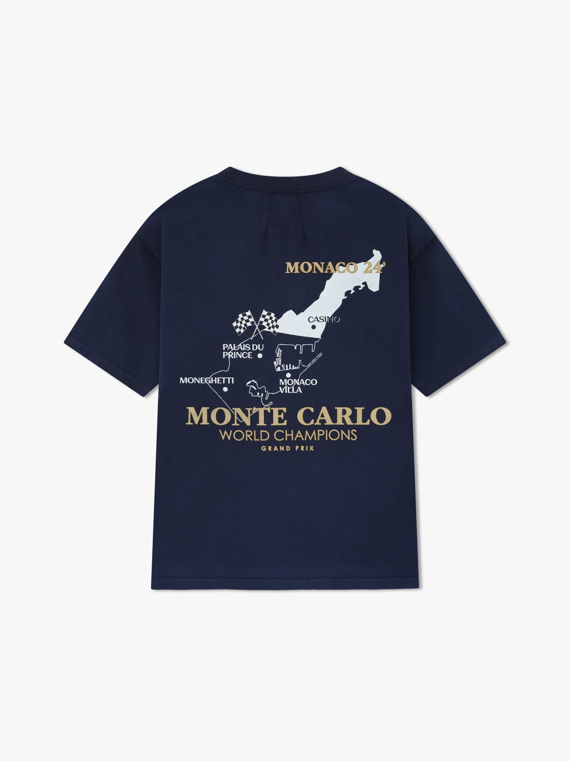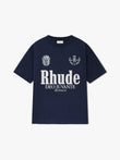 Custom-vintage fit cotton tee shirt with a ribbed neckline and short sleeves. Features RHUDE DEO JUVANTE MONACO designs printed on front and back.