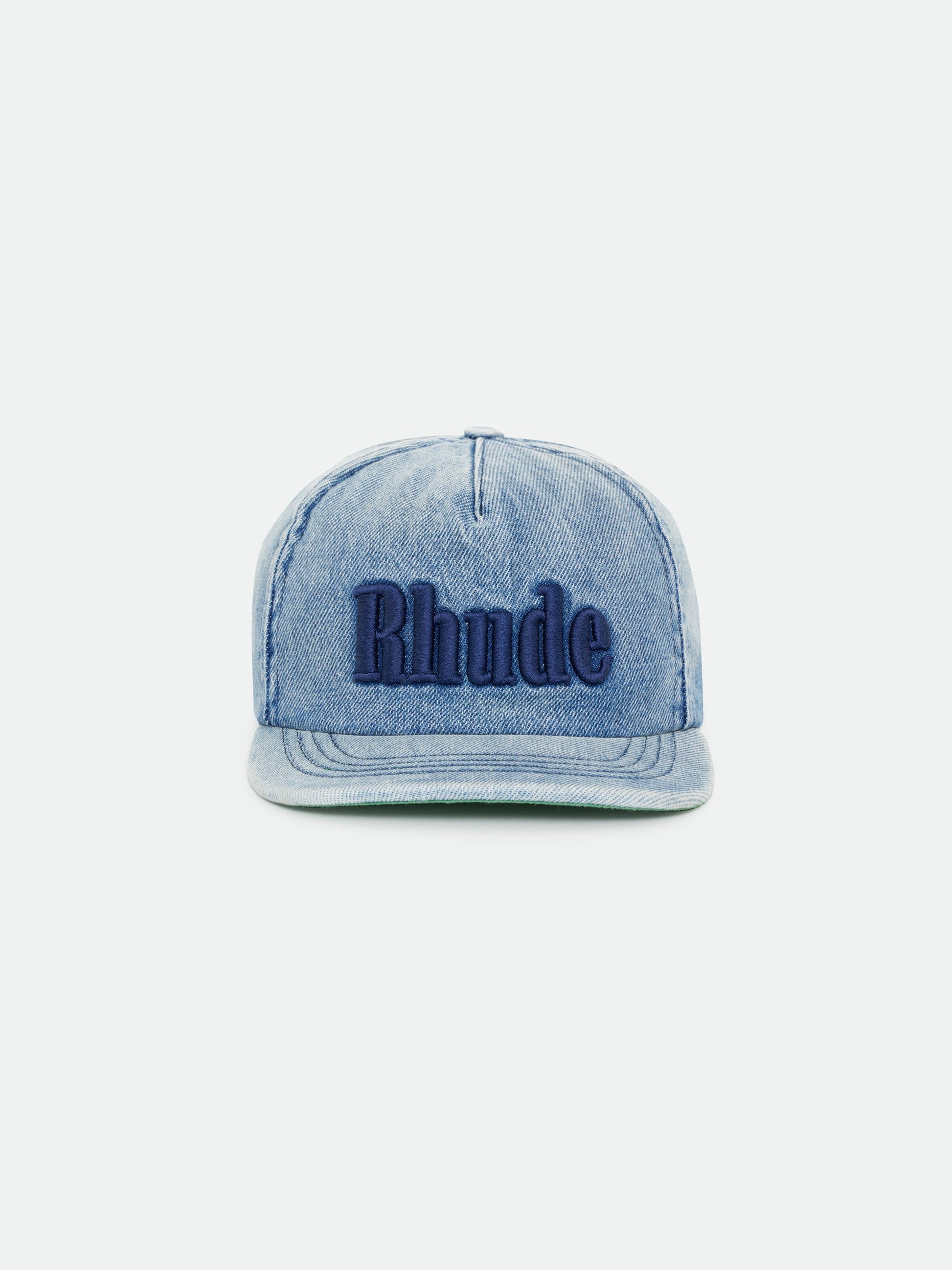 Heavyweight vintage denim cap with Rhude logo on front. Features an adjustable snap strap at the back, so you can adjust the fit to your preference, and green under brim.