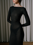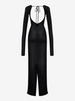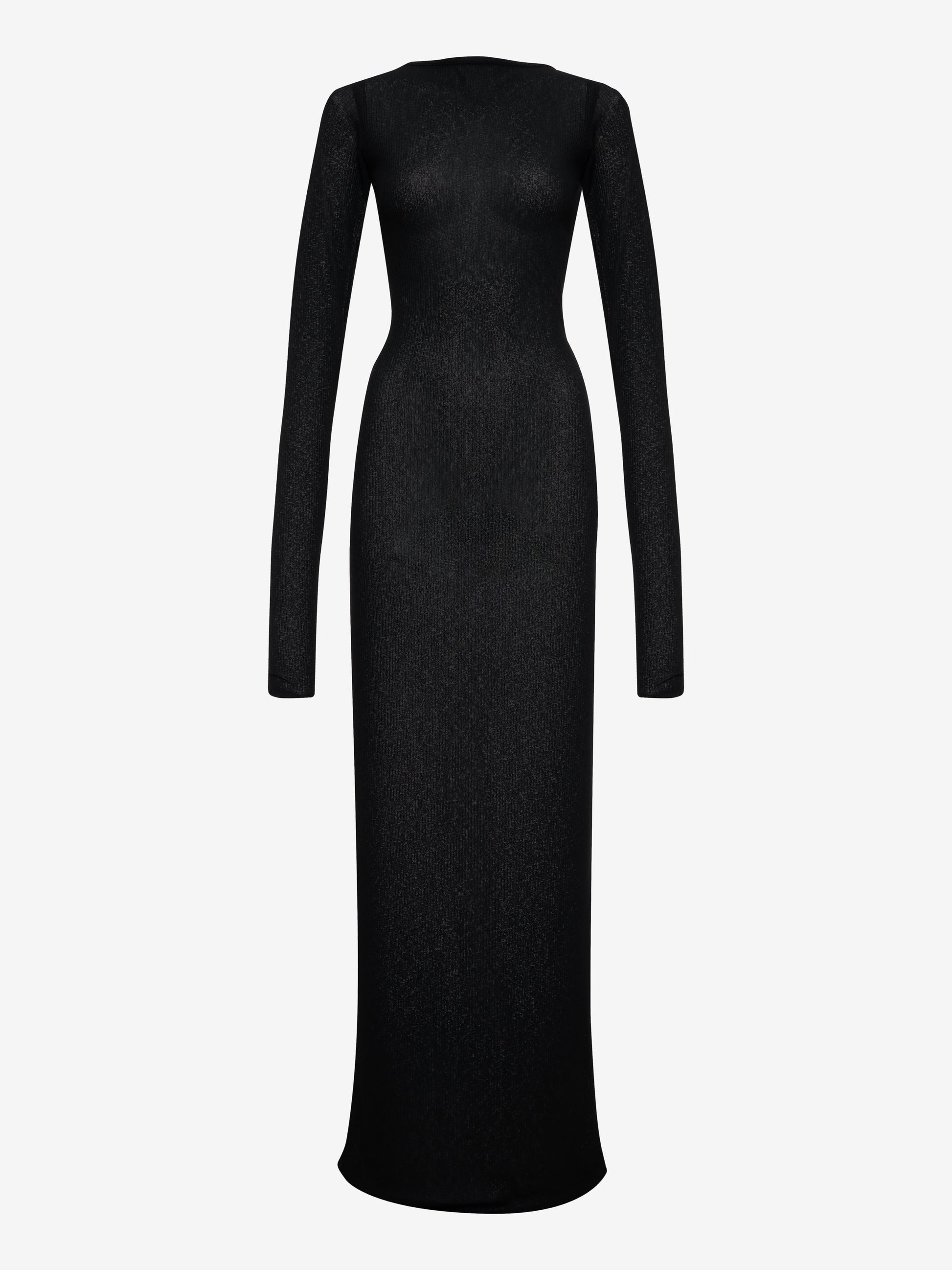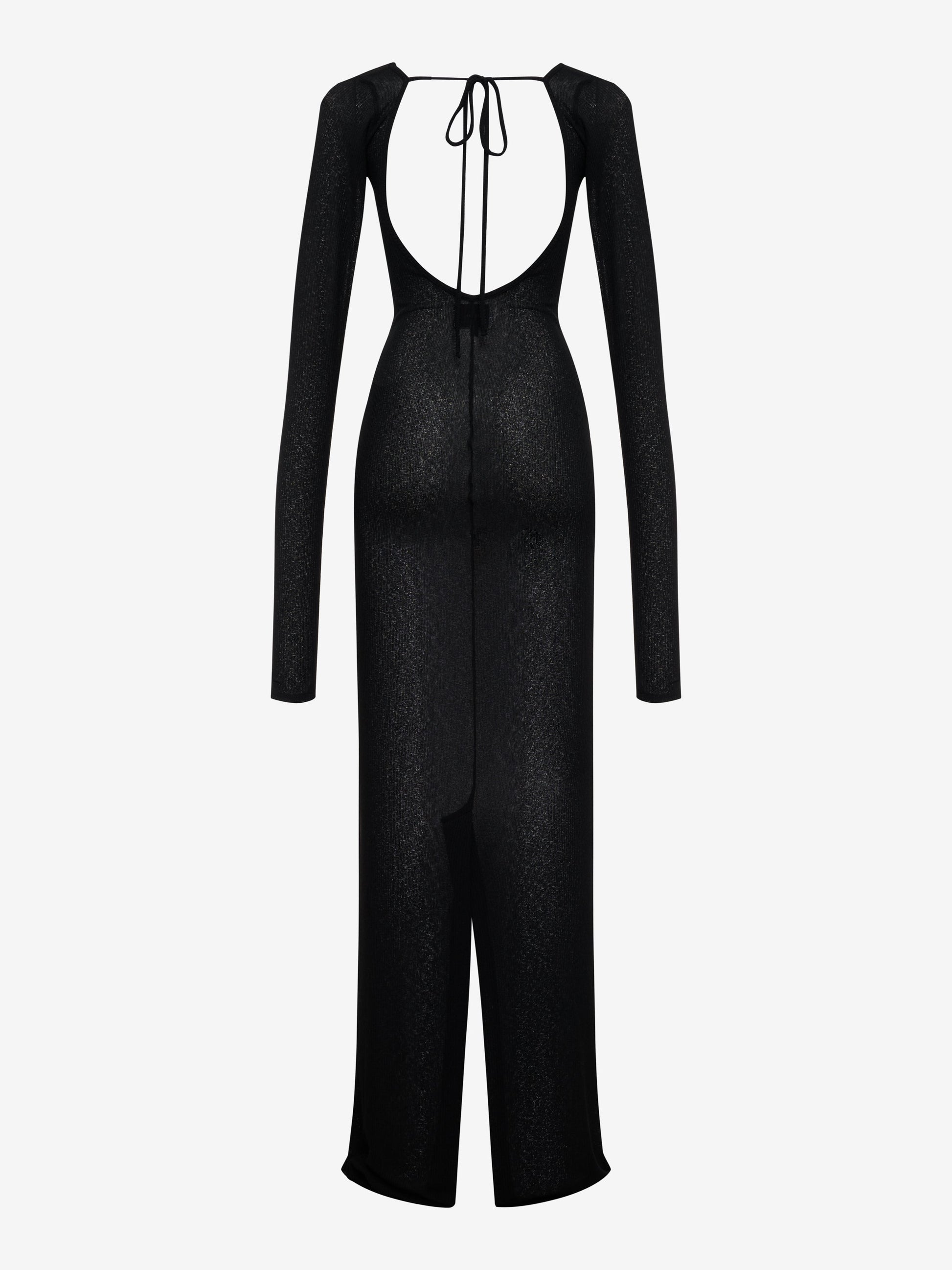 Black knit long sleeve jersey dress with a scoop back and a simple tie-back closure, crafted from high-quality materials.