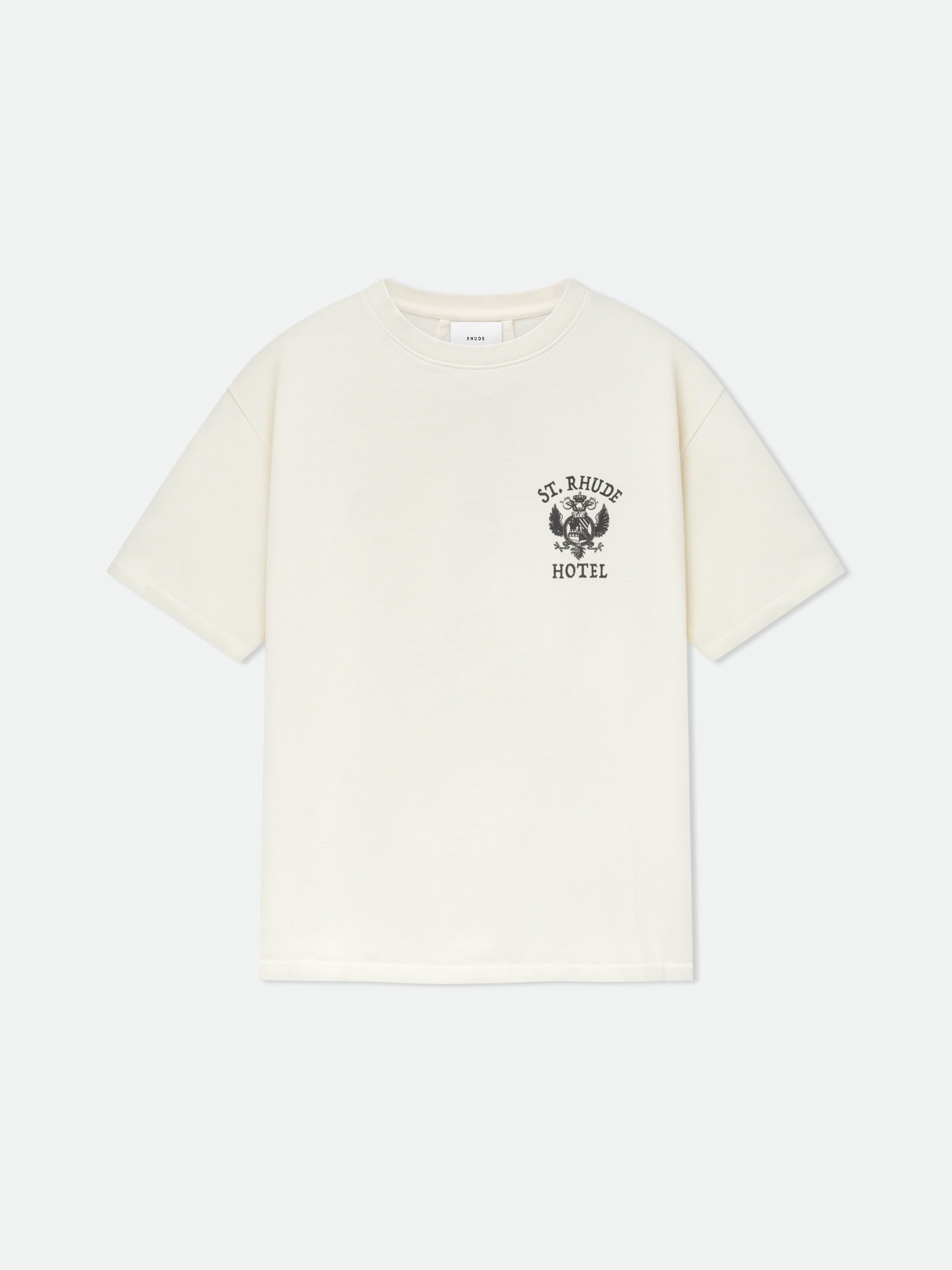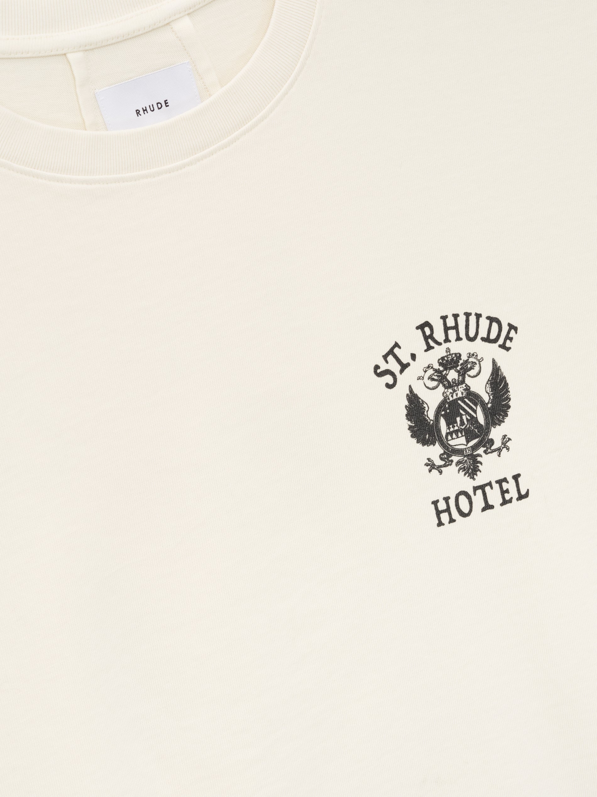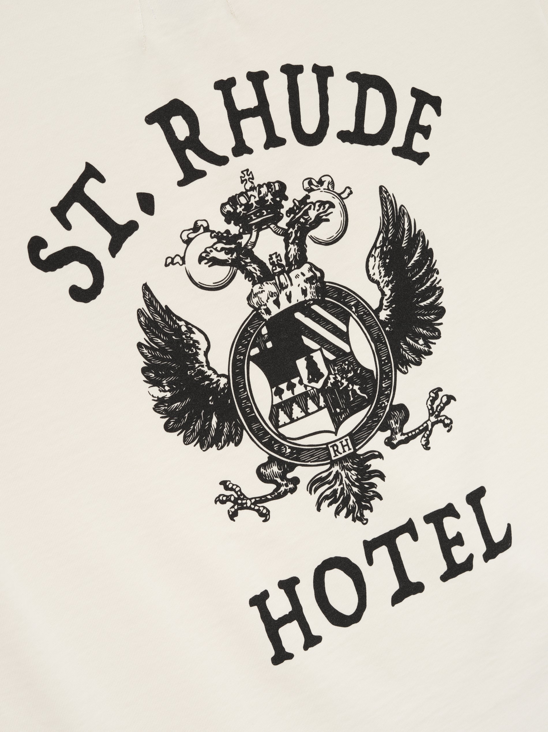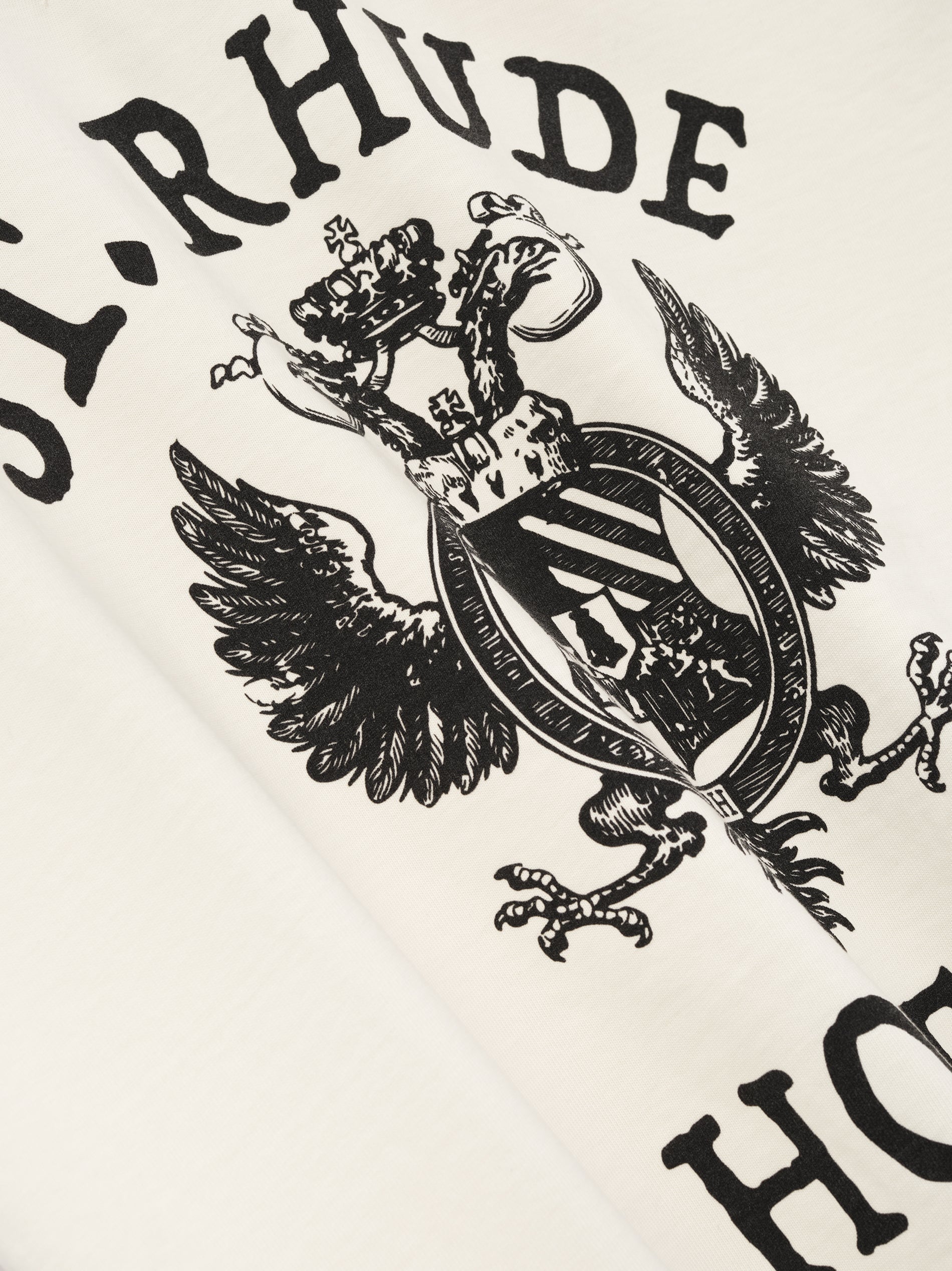 Custom-fit vintage wash cotton short sleeve tee-shirt with Rhude seal logo graphics graphics printed at front and back.