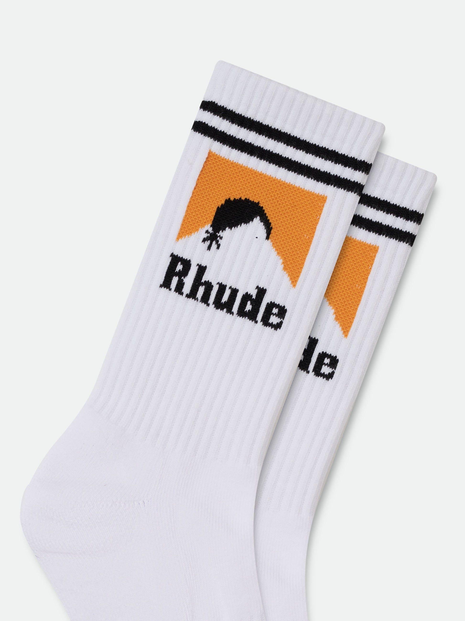 Signature cotton-poly sport sock features Rhude moonlight logo and stripes detail. Designed for athletics and leisure activities.