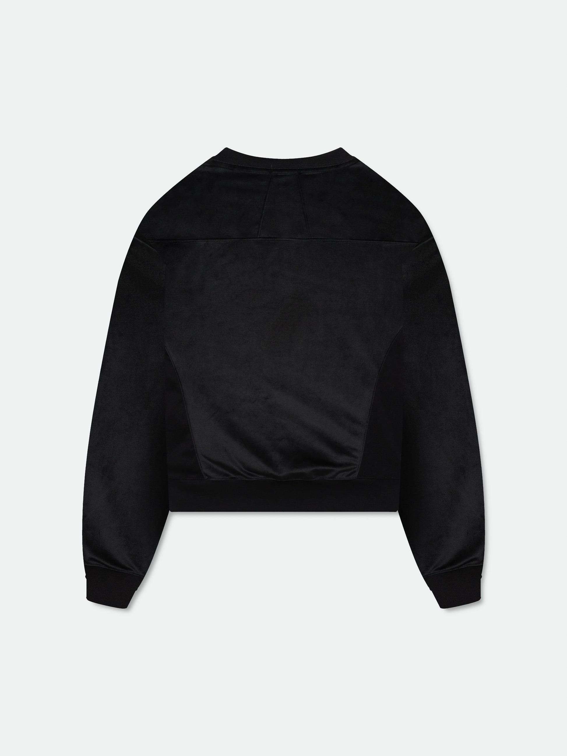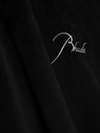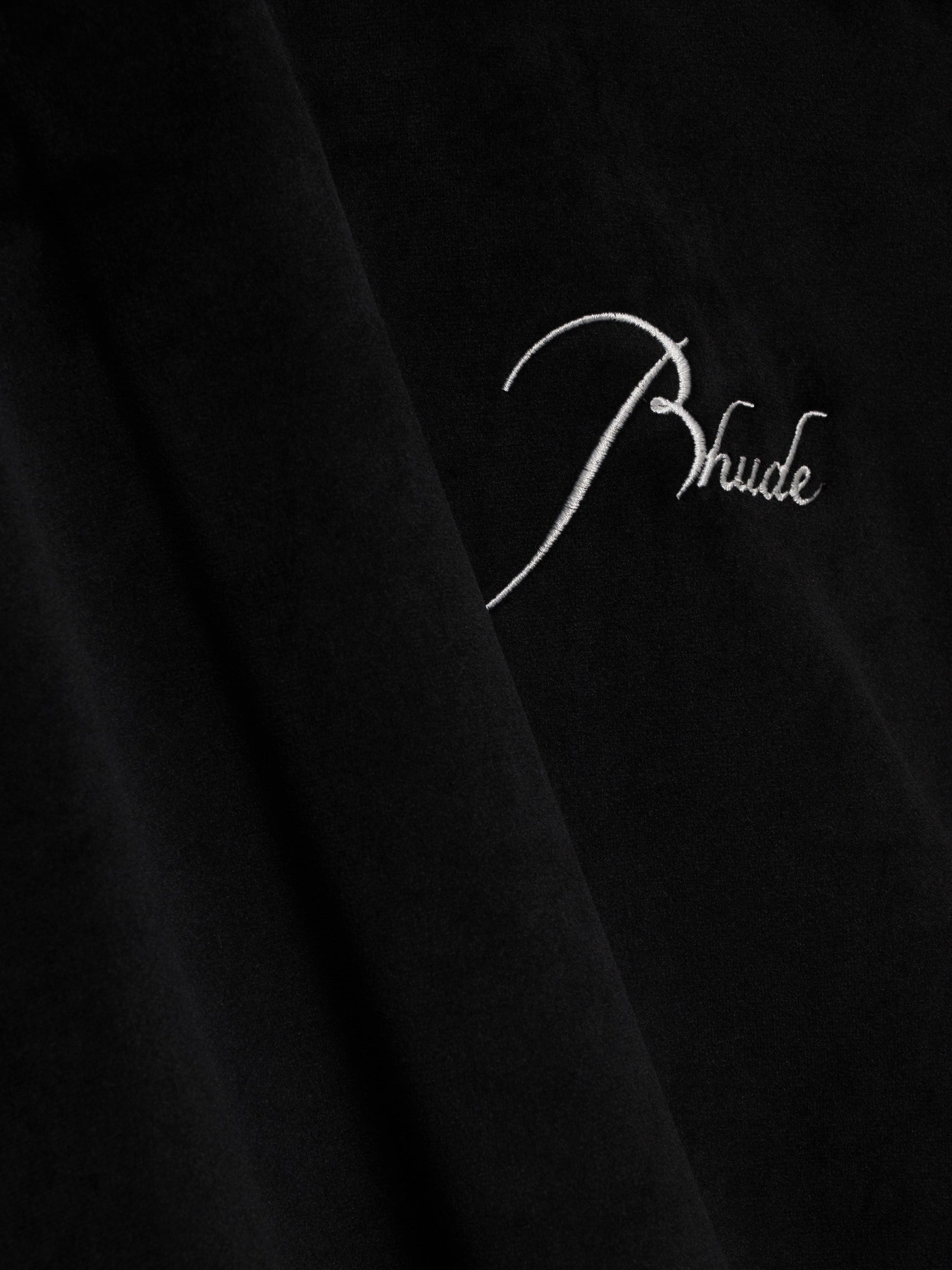 Long sleeve velour crewneck with Rhude classique script logo embroidered on the front, with a clean back. Featuring a kangaroo front pocket, dropped shoulders, and pull over styling.